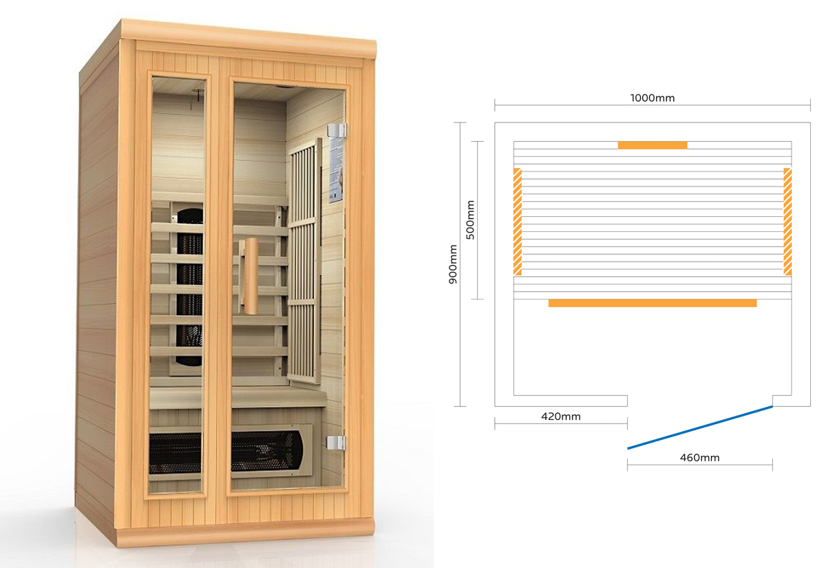 Unsere 1-Personen-Infrarotkabine 1 Luxor ist mit 100 cm unsere breiteste 1-Personen-Infrarotkabine. Mit einer Breite von 100 cm, einer Tiefe von 93 cm und einer Höhe von 190 cm ist diese Infrarotkabine ein sehr kompaktes und platzsparendes Modell. Die große Glasfront an der Vorderseite sorgt dafür, dass diese Kabine sehr offen, hell und freundlich wirkt. Diese Kabine wird standardmäßig mit getöntem Glas geliefert. Die Kabine ist im Innen- und Außenbereich aus White Cedar (Hemlock) oder kanadischer roter Zeder (Aufpreis) gefertigt und mit 4 Infraheat™ Strahlern ausgestattet.