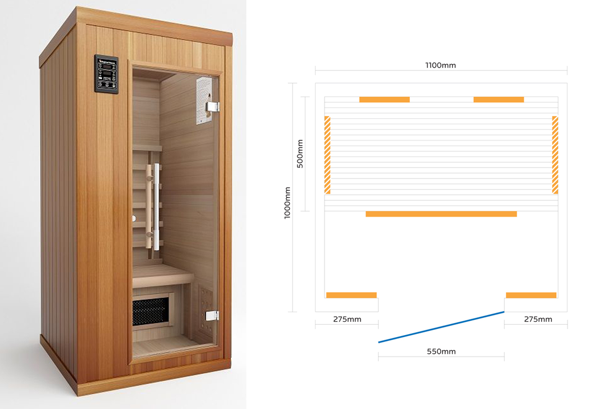 Unsere 1-Personen-Infrarotkabine 1 Physio ist unsere kompakteste 1 Personen-Kabine. Sie kann durch diese kompakten Abmessungen praktisch überall installiert werden. Die Kabine besteht an der Innen- und Außenseite aus kanadischem Hemlock Holz oder kanadischer roter Zeder (Aufpreis) und ist ausgestattet mit 4 Infraheat-Strahler.