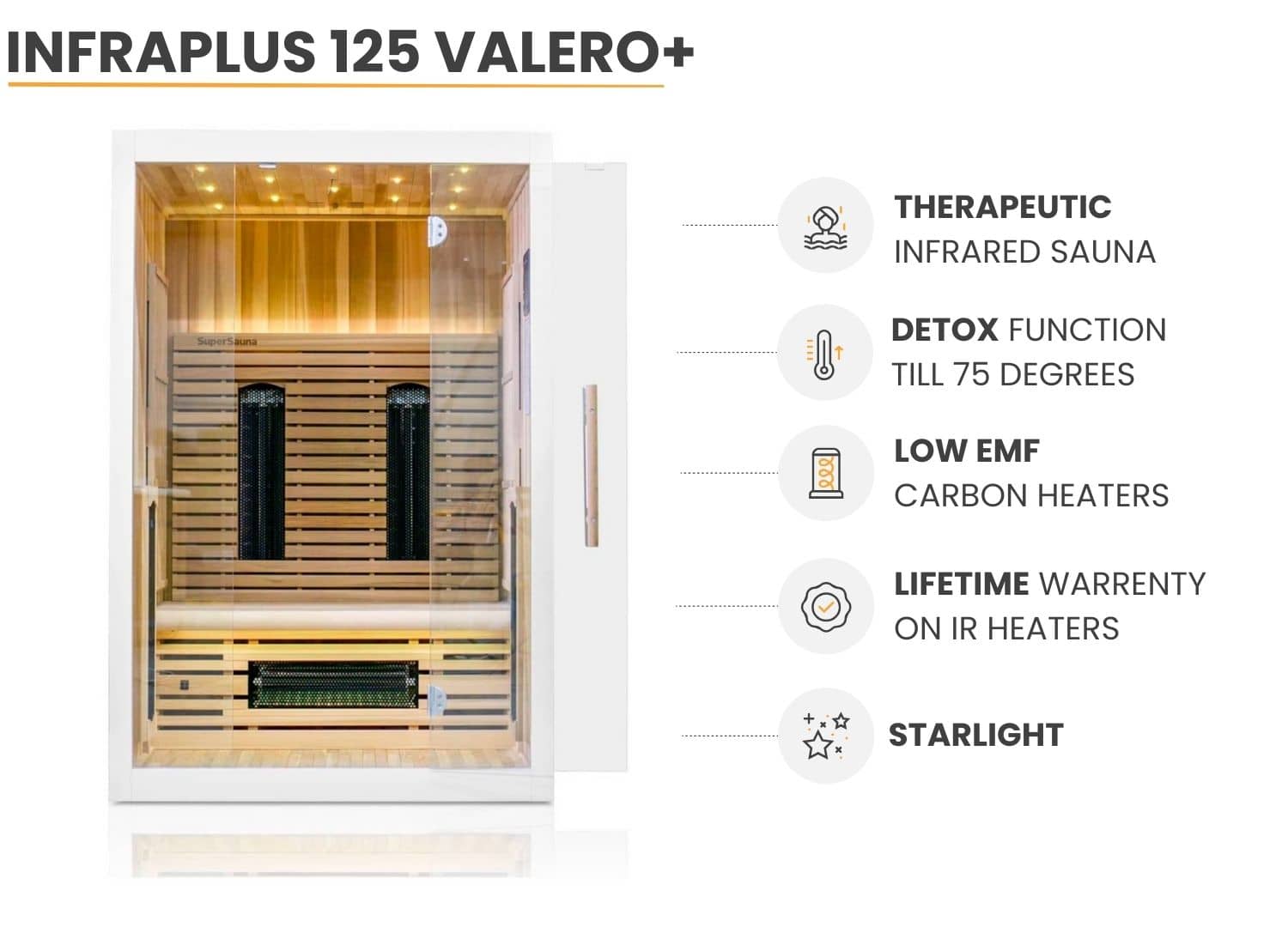Unsere 2-Personen Infrarotkabine 125 Valero passt dank ihres modernen Designs und der großen Glasfront perfekt in jedes zeitgemäße Interieur. Durch die schlichte und hochwertige Verarbeitung der Sauna besteht die Möglichkeit, diese einzubauen, sodass sie vollständig mit Ihrer Einrichtung verschmilzt. Aber auch als freistehende Sauna bietet sie eine elegante Optik.