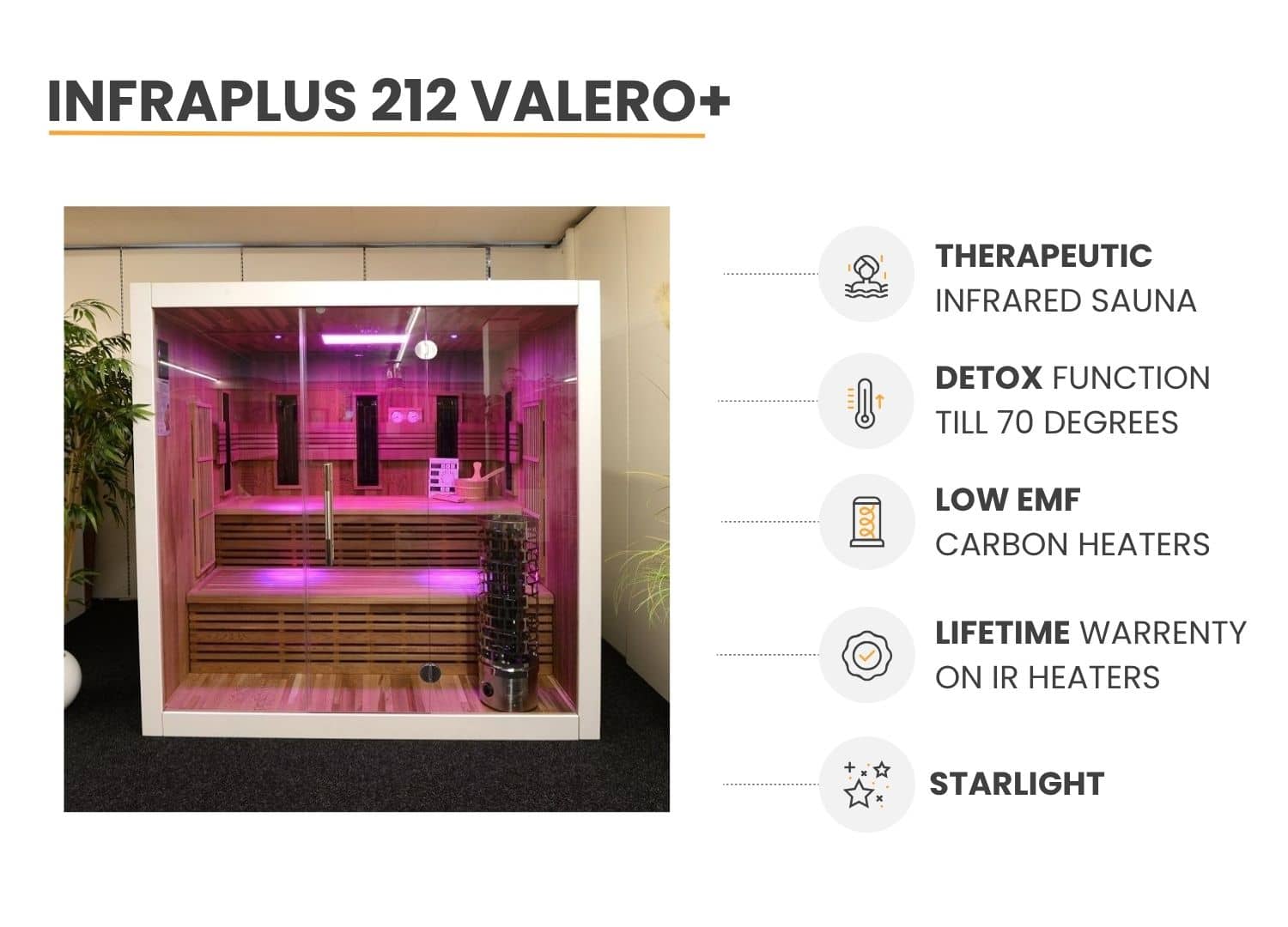 Infraplus macht es möglich Ihre Kabine mit Infraheat Vollspektrum-Strahlern auszustatten (wahlweise). So haben Sie nicht nur Mittel- und Langwelleninfrarot IR-Wärme, sondern auch einen Teil Kurzwellen (IR-A). Kurze Wellen dringen noch tiefer in Ihre Hautlagen ein, wodurch der therapeutische Wert erhöht und Muskeln und Gelenke schneller erreicht werden. In Absprache mit dem Kunden sorgen wir für die perfekte Balance in Ihrer IR-Sauna. Die Vollspektrum-Strahler können auf kundenspezifischen Wunsch platziert werden, sodass für jeden eine passende Konfiguration möglich ist.