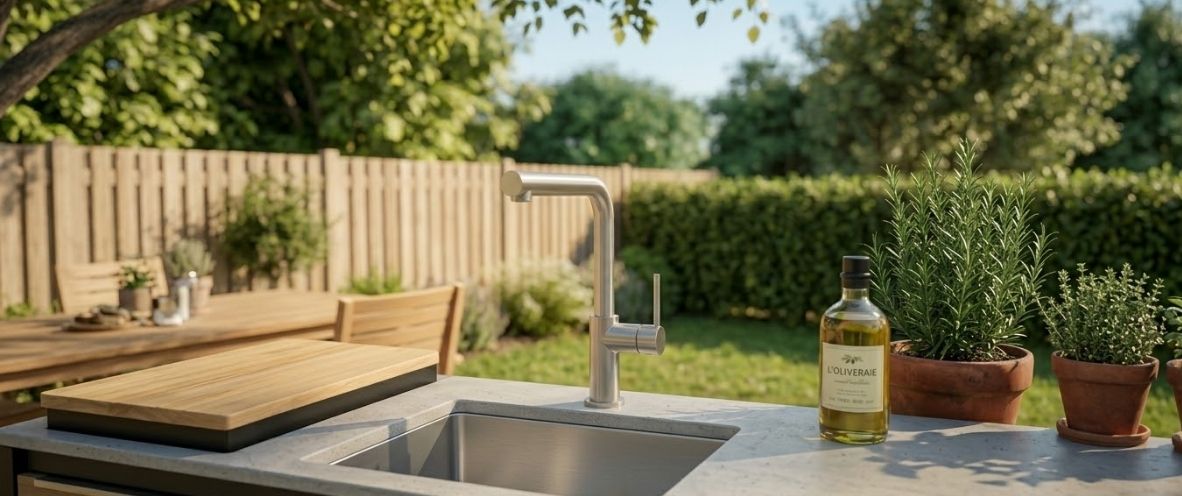 Als autorisierter Lieferant bieten wir das komplette Quooker-Sortiment an. Diese beliebte Konfiguration wird häufig gewählt und passt stilvoll und praktisch zu den Grillnest-Außenküchen.
